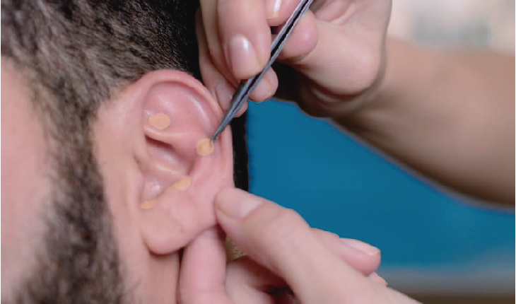 Este método de tratamiento es un microsistema de acupuntura sin agujas, por medio del cual se tratan diversas enfermedades. Cada punto o terminal nervioso está relacionado con un órgano o función en particular, en la terapia utilizamos un detector de puntos que recorre todo el pabellón auricular en búsqueda de algún terminal nervioso desequilibrado , de los 120 puntos existentes se seleccionarán 5 puntos que permanecerán durante un determinado de acuerdo a lo que se quiera mejorar o se diagnostique.